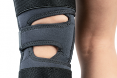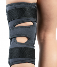 The orthosis is a support for the knee joint, the 4 spring type metal splints, 2 for each side providing stability and safety in use. Due to its particular shape, it can be used also in case of a deformed knee. The compression can be adjusted by the back closure system.