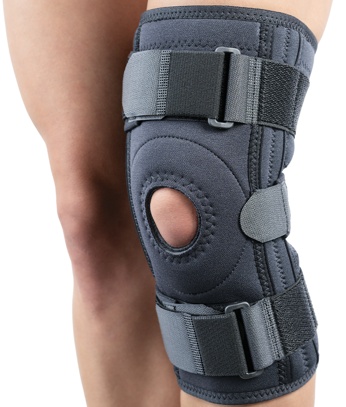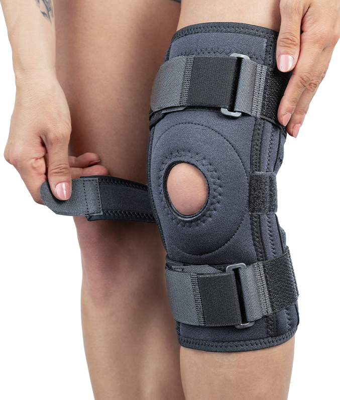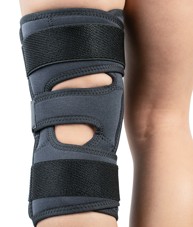 • 2 straps for fixation provided with elastic hook and loop fastener, that mold to the conical anatomy of the thigh and calf, preventing the orthosis from slipping