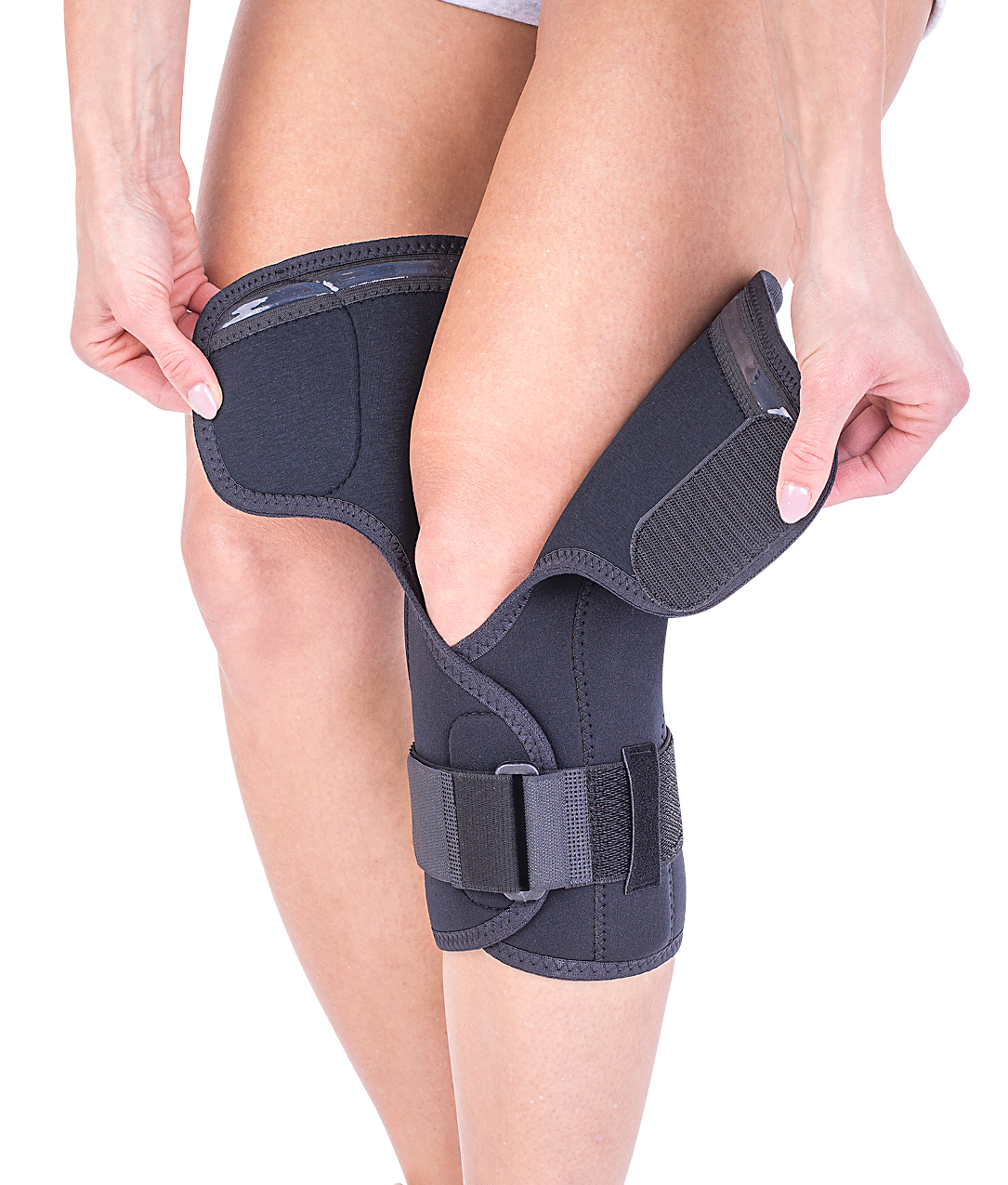The orthosis is a support for the knee joint, the 2 polycentric, lateral metal splints providing stability and safety in use. Due to its particular shape, it can be used also in case of a deformed knee. The compression can be adjusted by the frontal closure system and the 2 fastening straps