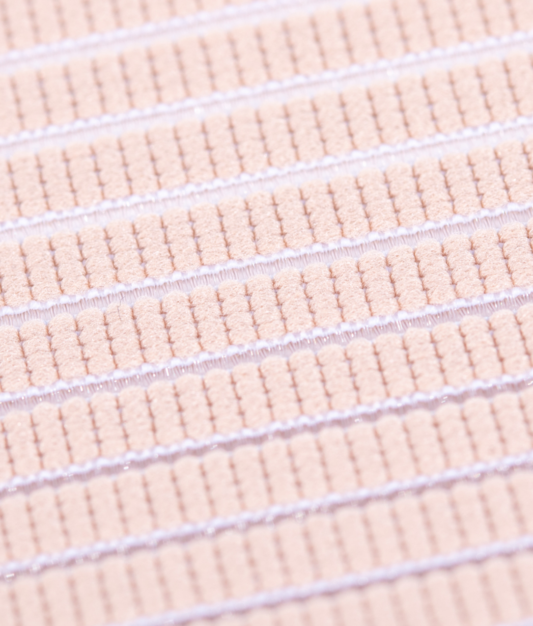 For an easy application it is provided with helping strips. The 2 lateral and the 2 paravertebral plastic rods stabilize the thoracolumbar region, slightly reducing lordosis and kyphosis, and the compression exerted by the elastic bands stimulates local metabolism, reducing muscle tension and pain.