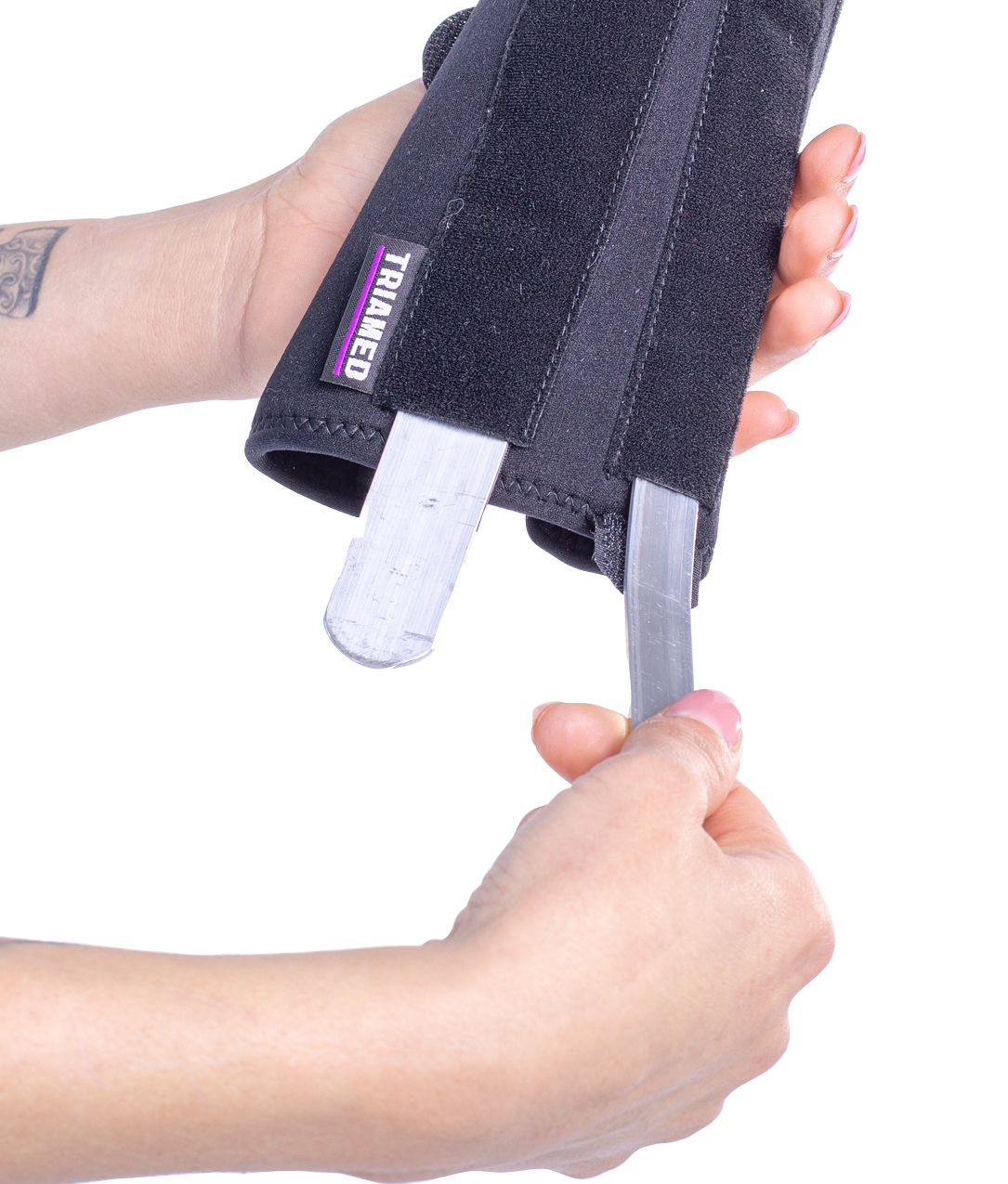 • 2 inserted plastic splints on the dorsal side of the hand.