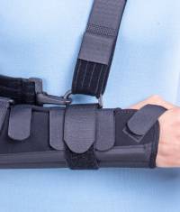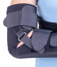 The orthosis stabilizes and immobilizes the elbow and the radiocarpal joint.