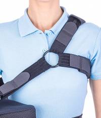 • arm support made of one single piece that holds the arm on the cushion, provided with a support strap for the thumb and a thoracic harness. This is made of 4 straps adjustable by cutting them and repositioning the “crocodile” type hook and loop fastening, provided with 2 rings and 2 protective sleeves.