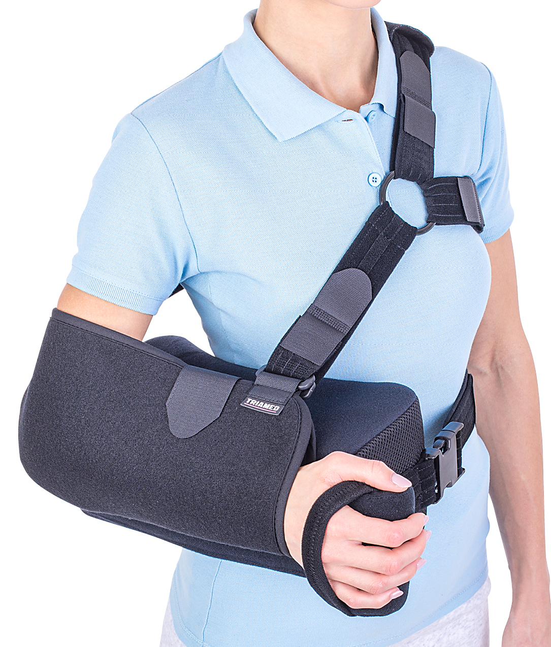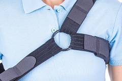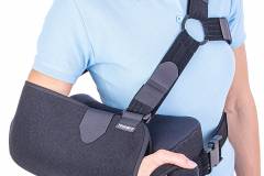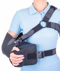 The orthosis positions and secures the arm in abduction at 15° to the thorax, by using the support cushion.