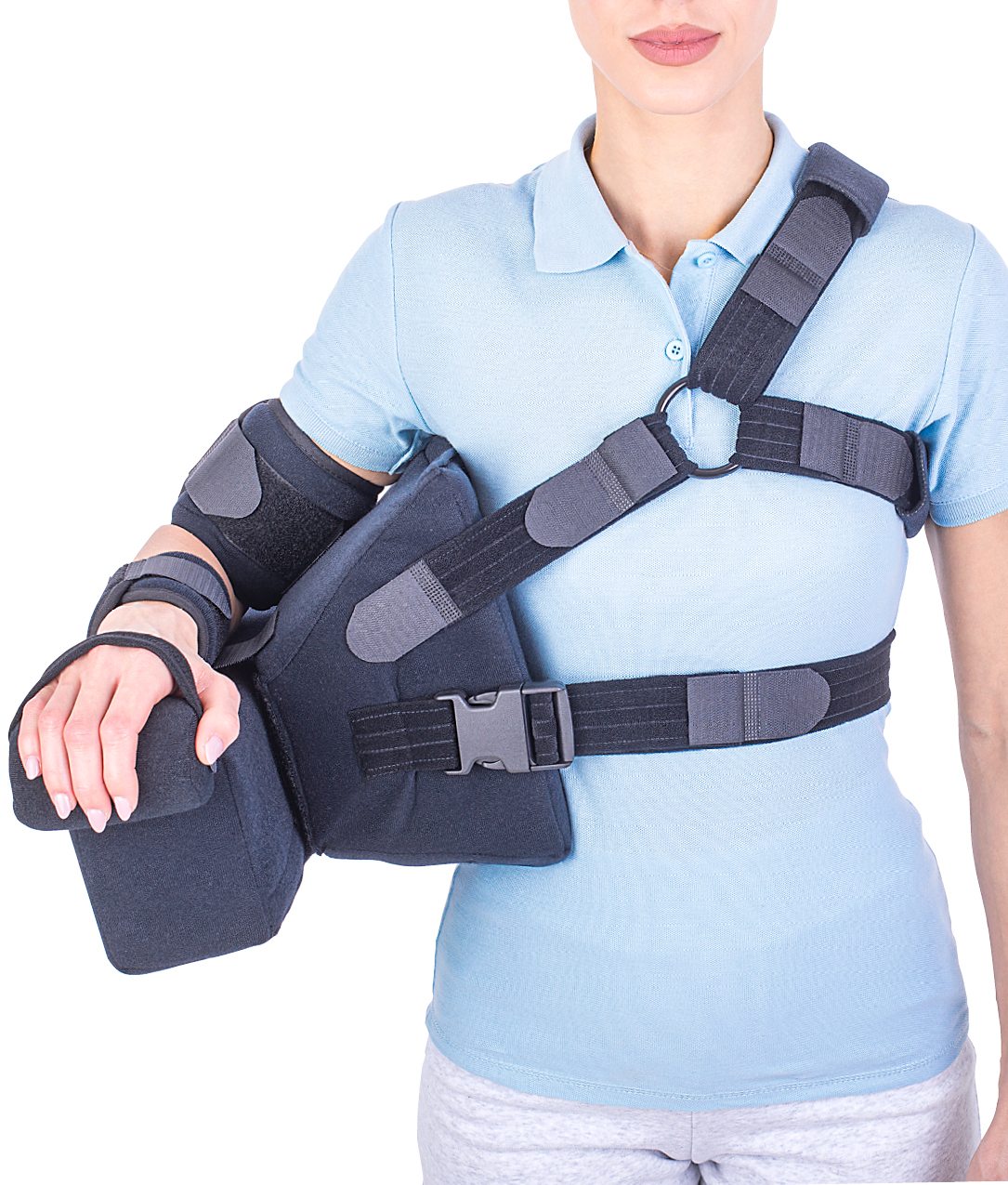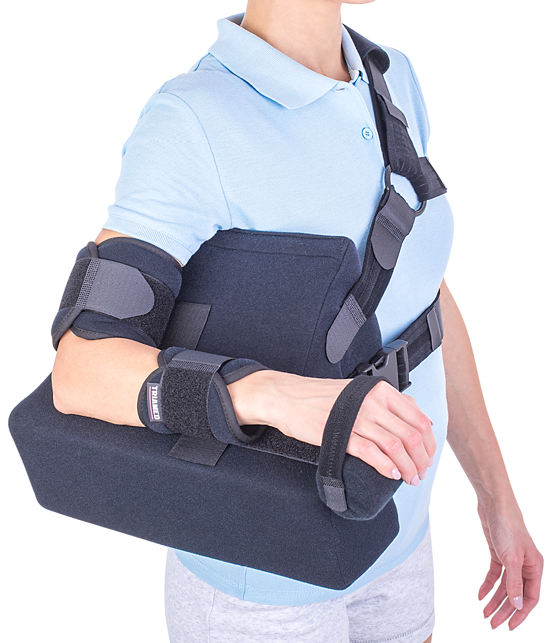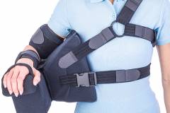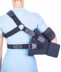 The orthosis has the possibility of fixing the arm in abduction at 45° or 60° from the chest, by changing the position of the support cushion.
