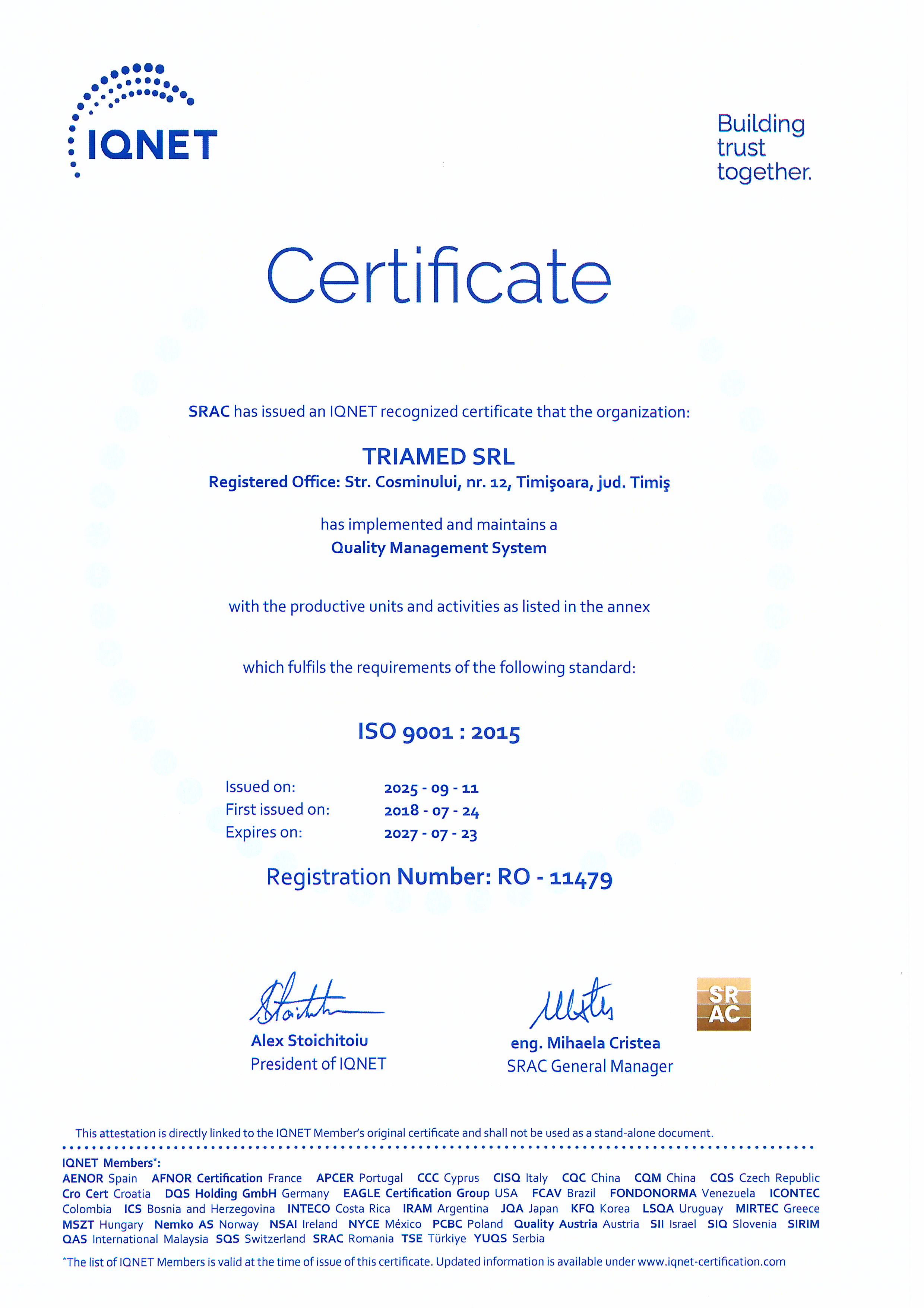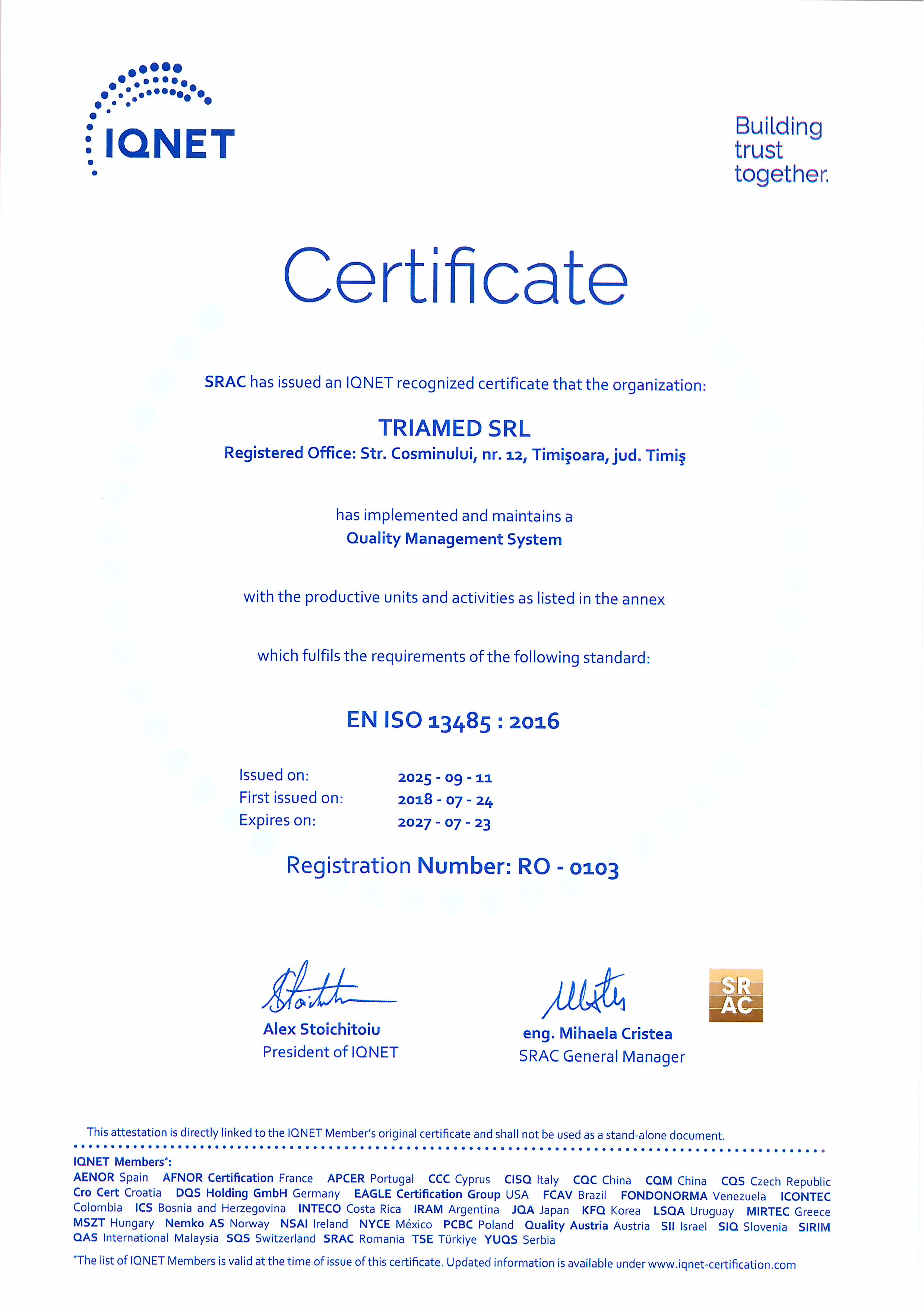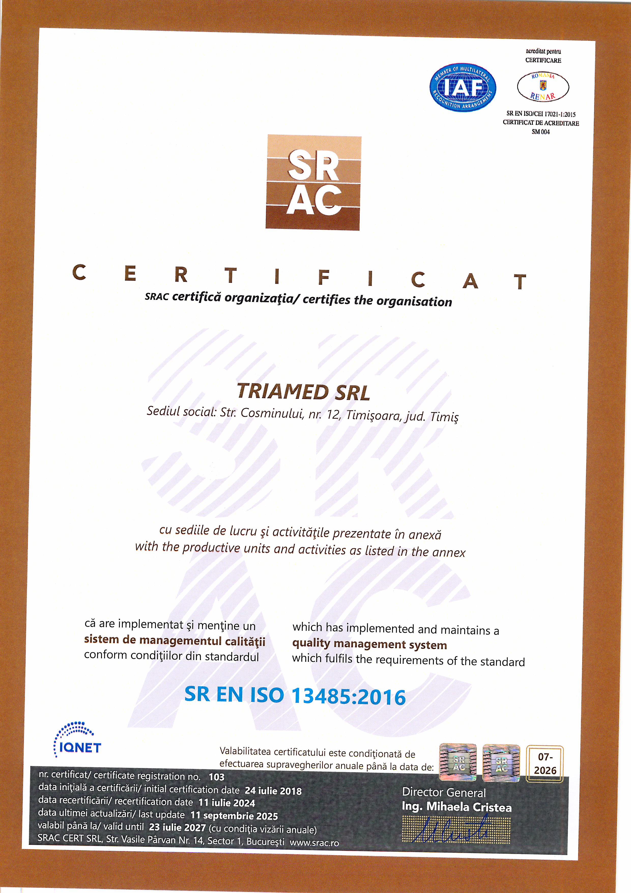 Pentru a crea cadrul optim care să permită realizarea obiectivelor noastre, am implementat şi menţinut sistemele de management al calității ISO 9001:2008/2016 și ISO 13485:2015.